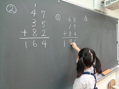 一の位でくり上がり、十の位でくり上がる計算です。小さなミスをなくして、確実に身につけてほしいと思います。
