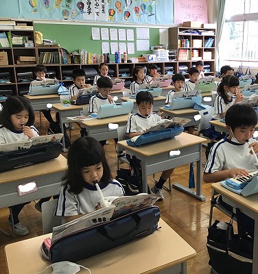 「♪かえるのがっしょう」では、“ゆびずらし”に気をつけて、輪奏に挑戦しました。遅れてスタートし、音が重なる響きを感じ取ります。そして、ひとフレーズ毎に終わっていく感じを楽しみます。3輪奏にチャレンジし、タブレットに録画をして、響き合いを確認しました。
