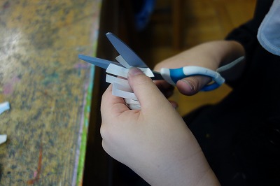 細く切るときも、できるだけ刃先を使わずに切ると、きれいな切り口になることも試してみました。「チョキンッ!」と刃先まで使ってしまわないように集中する児童は、指先からも真剣さが伝わってくるようでした。