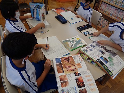 まずは、自分自身で調べたいことを決めます。そして、図書室で調べたいことに関係する本を手に取り、ノートに初めて知ったことやわかったこと、気づいたことなどをメモ書きしました。