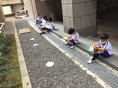 グラウンドの鉄棒前です。鳥のさえずりや鉄棒後ろの草むらから、コオロギの鳴き声も届きました。校舎内外の音を探しに出かけ、身の回りの音を感じ、“注意して聞く時間”の楽しみを共有したいと考えています。