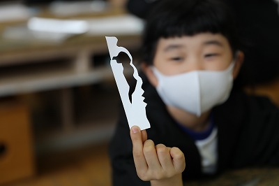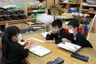 どんどん思い付くままに紙を切るのですが、児童は、1つの形が生まれるたびに「○○みたいな形になったよ。」「細く切ったら○○になった。」と、次々に偶然生まれた形を何かに見立てていました。