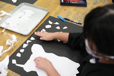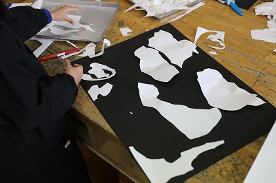 次に、切り取った画用紙を黒い画用紙の上に並べ、見えてきた形から白い画用紙だけで絵に表していく活動です。