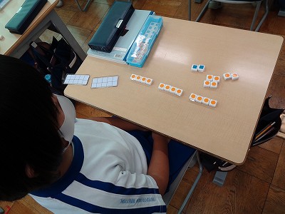 「4この3つ分」や「2この5つ分」を、数図ブロックで表しました。