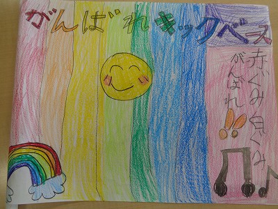 紙に『がんばれー』や『○○のようにボールをけろう』、『ナイスキックだ!』などのメッセージを描いて、小旗を仕上げています。
