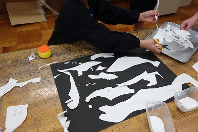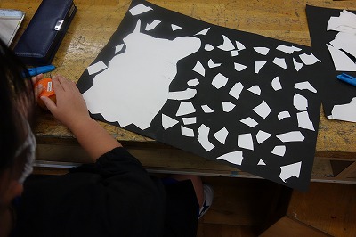 ある程度、場所が決まったら,のりで貼り付けて絵にしていきます。小さな紙をたくさん貼っている児童はなにに見立てたのでしょう。画面の左側には,なにかがいます。
