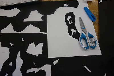 今日は,前回にどんどん切り取って生まれた「なんでもない形」を黒いか身の上に置いて,何かに見立てながら絵に表す活動です。意図的な形に切り抜いたものではないので,少し自信なさそうにしている児童もいたので「自分がそう見えたらいいんだよ。」「人によっていろんな見え方があるからおもしろいんだよ。」と声かけをしました。