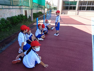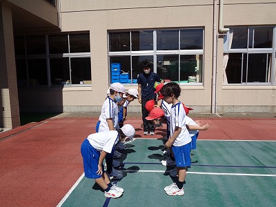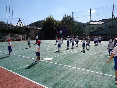 攻撃と守備のポイントを話し合って、確認している姿が見られました。その後、赤A・赤Bvs白A・白Bに分かれ、キックベースボールを行いました。