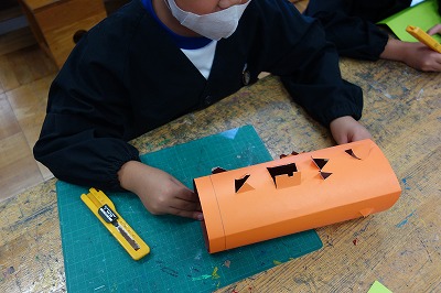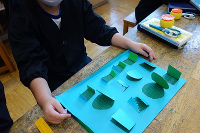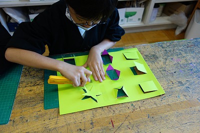 5・6校時の図画工作では「まどからこんにちは」の学習です。慣れないカッターナイフを使って、思いついた形や開き方をする窓をたくさん切り開いていきます。
