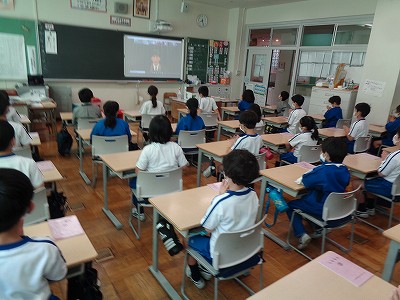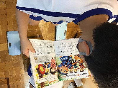 今日は、「♪村まつり」を歌って、“ドンドンヒャララ ドンヒャララ”と、お祭り気分の扉を開きました。「鎮守(ちんじゅ)」や「豊年万作(ほうねんまんさく)」など、明治時代から歌われている唱歌「村まつり」の流れを持つ、メロディと歌詞ですが、2年キッズの歌声で、3番までしっかりとマスターしています。