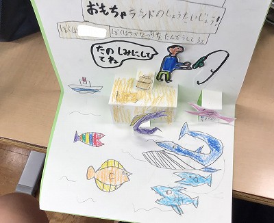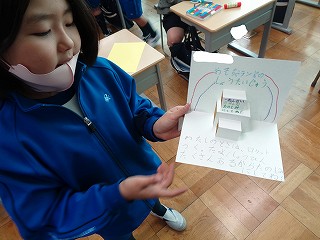 後半は、一年生と「おもちゃ交流会」の招待状作りを行いました。飛び出すしかけがあるメッセージカードです。