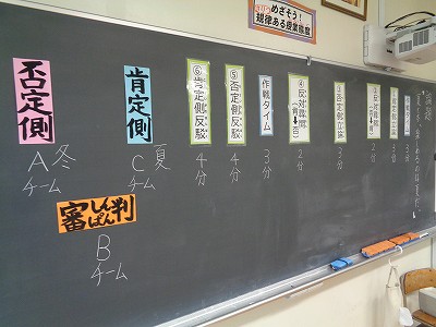 今日は、肯定側:Cチーム 否定側:Aチーム 審判:Bチームで行いました。