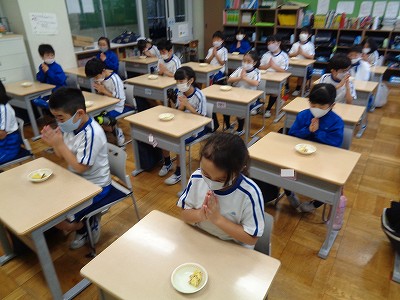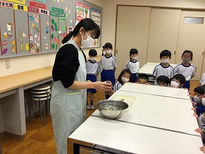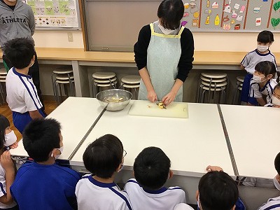 家庭科室で調理する予定でしたが、新型コロナ感染症のため、栄養教諭の居相先生に調理して頂きました。