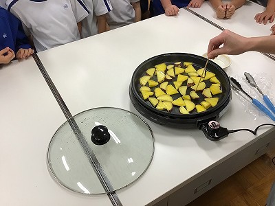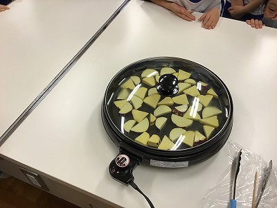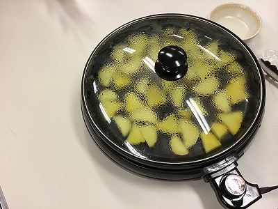 まず、サツマイモのアクをとるために、水につけてあったサツマイモを半月切り、いちょう切りにしてホットプレートに並べていきます。