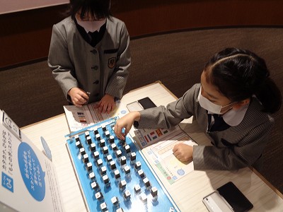 体験シートを手に「甲骨文字占い」や「国旗スタンプ」を楽しみました。