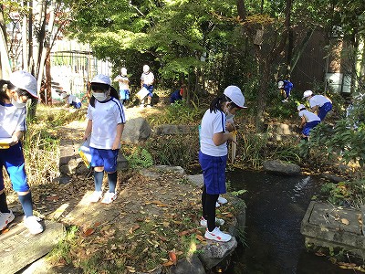 5校時の生活は『秋のビオトープ』の2回目です。給食の時間から雨が降り、ビオトープに行けるかどうか心配していましたが、5校時が始まると、なんと!晴れてきて『秋のビオトープ』の学習が予定通りできました。