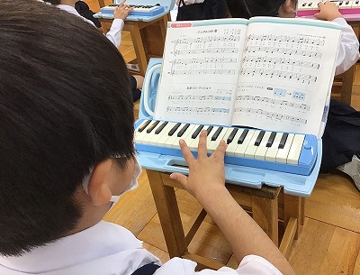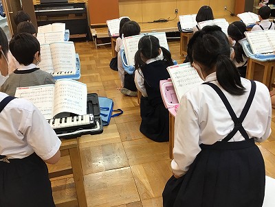 教室では、メロディパートと伴奏パートを合わせて奏でる時間を過ごしました。“合奏”として完成させるためには、メロディの後半部分がきっちりと演奏できることがポイントです。ひとりひとりできるカ所を増やし、「鉄琴や木琴と歌」や「鍵ハモでの合奏」にと仕上げていきたいと思います。