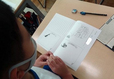 前の時間は、“七の段”や“八の段”の歌い回しが難しく感じましたが、今日は、メロディが分かっているので、つっかかることなく歌い上げていました。息継ぎが大変なところもあって、“いそがしい!”という印象の歌ですが、楽しい歌には間違いありません。算数の九九と合わせて、音楽でも得意になってほしいです。
