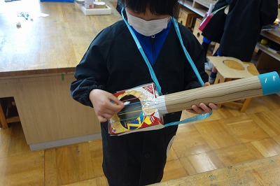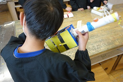 児童は自分のアイデアで、また友達のアイデアに触発されて、「ここ、もっとこうしよう。」「ここにはこんなものをつけてみよう。」など、つくろうとするものを更新していきます。また今回のような題材では、試したり遊んだりしながら作っていくことが多いので、時間とともに形が変わったりときには壊れたりすることもよくあります。