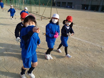 冷え込む朝、寒さ対策をして、根っこマラソンに取り組みました。