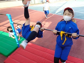 鉄棒あそびと一輪車の学習です。今日も2つのグループに分かれ、鉄棒の練習を行いました。