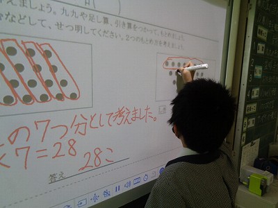 算数科「九九のきまり」の学習を行いました。今日は、九九の段にないかけ算の計算方法を考え、説明することが課題でした。まずは、線で囲んで計算方法を図に表す活動です。