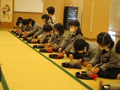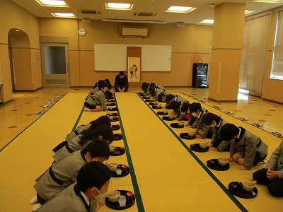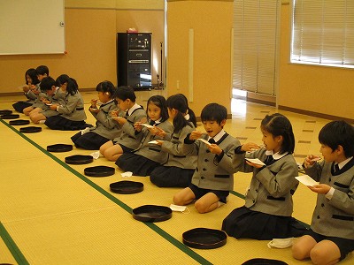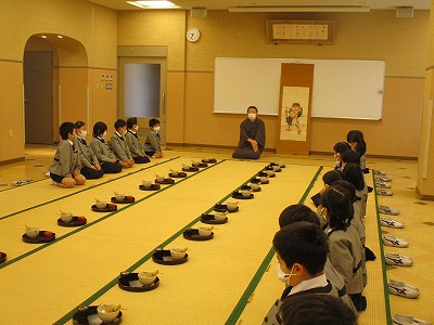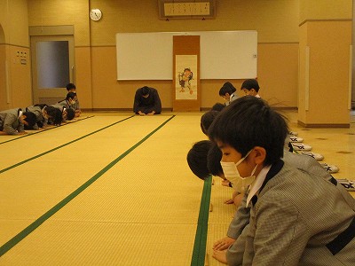 子ども達が苦手なのは、正座です。どうしても足がしびれてきます。途中で足のしびれをとる時間をとって、正座を続けています。