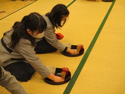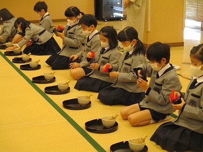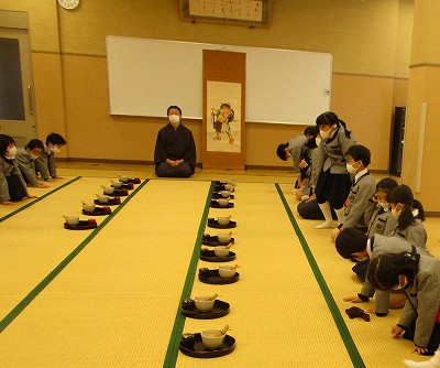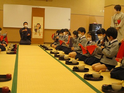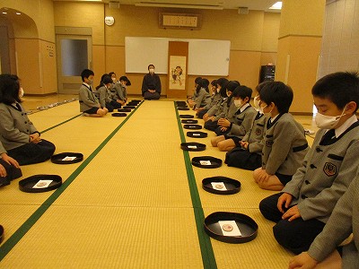 礼法の5回目です。帛紗さばき、盆略点前の練習です。子ども達も、5回目となると先生の所作を見ながら帛紗さばきが上手にできるようになってきています。