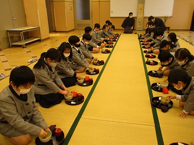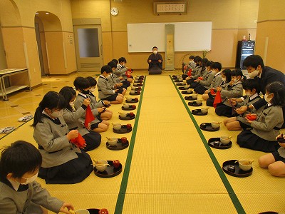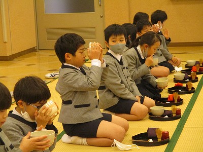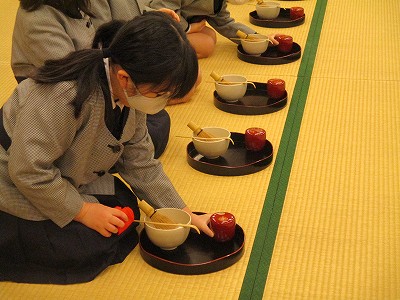 一通りお作法の練習が終わったら、子どもたちが楽しみしているお菓子です。今日のお菓子は、丑年にちなんで、絵馬に丑が形取ってあるお干菓子でした。お菓子を頂いてから、自分でお茶を点てて、自分でお相伴しました。今年スタイルです。
