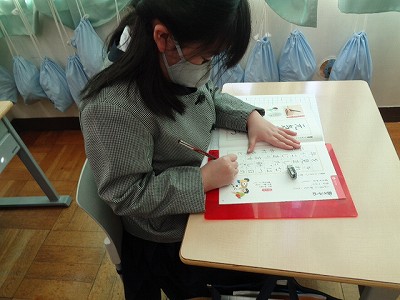 鉛筆の握り方、正しい姿勢を確認し、お手本を一画一画、丁寧になぞることができました。