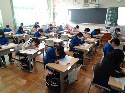 1校時の国語は、漢字検定に向けて、漢字プリントに取り組みました。本番を意識して、机の上に鉛筆2本と消しゴムを準備して、姿勢を正して書き進めました。
