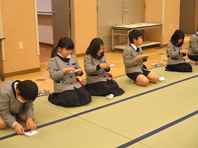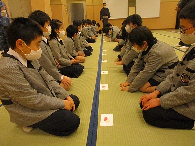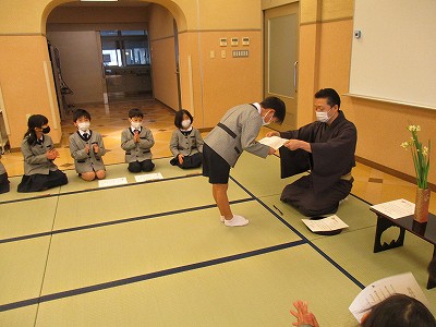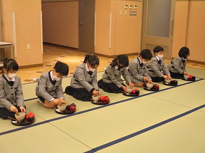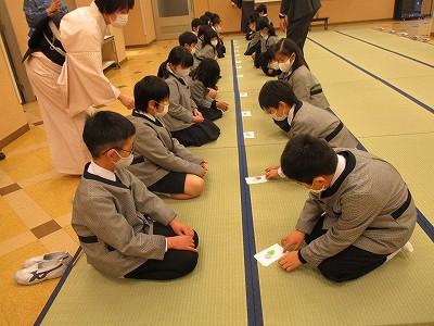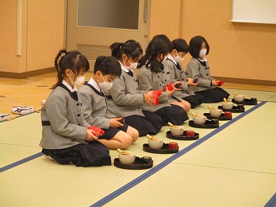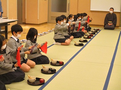 今までのお稽古のまとめとして、お茶会の手順で進めました。京都府に緊急事態宣言が出ているため、お家の方を招待してお茶会を開くことはできませんでしたが、心を込めてお客様をおもてなしすることの大切さを学んでくれたことでしょう。
