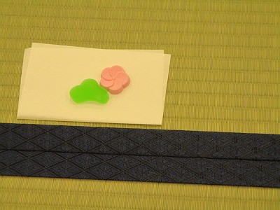 今日のお菓子は、ねじり梅の形の和三盆、と松の形をした琥珀のお干菓子です。