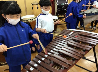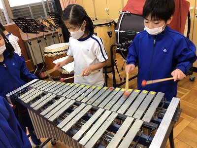 まず手始めに、木琴や鉄琴を使って、「ソレシレソー」の音をきっちりと演奏する練習を行いました。7つのチームが7台の楽器に分かれ、四分音符の長さや八分音符の長さに打ち分けた練習に取り組みました。