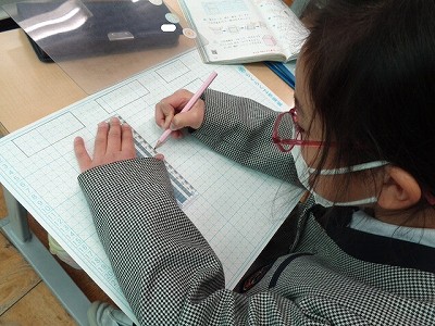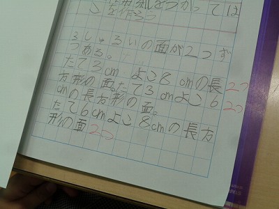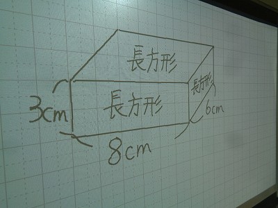 まずは、箱づくりをスムーズに進められるように、これまでの学習のおさらい(箱の形の構成要素である面の数や特徴)を全体で行いました。