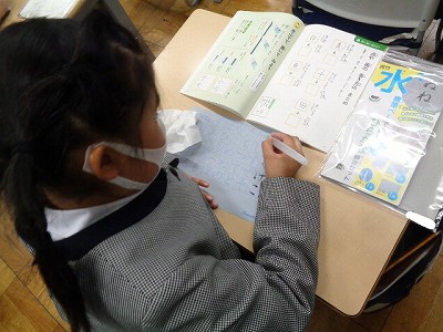 今日は、水書の学習を行いました。水書筆ペンを使って、ひらがなの練習です。