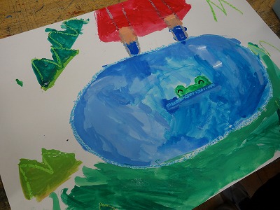 ある程度、クレパスで描き進むと、そろそろと準備を始めます。こわごわ絵の具を塗ると「みてみてー、こんな色になったよ!」「クレパスの所ははじくねー。」など色々な所で声があがりました。