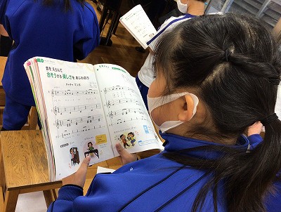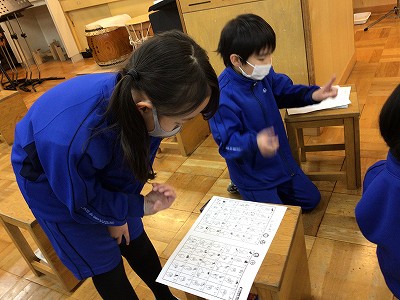前の時間に手話を付けて「♪さんぽ」を歌う活動をしました。今日も、明るい声の歌唱が始まると、1番の歌詞では、すぐに手を動かし足踏みも入れて歌い、2番3番の歌詞では、言葉とリズムをうまく合わせて歌うことができました。