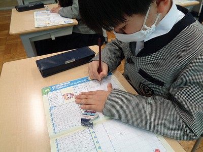 お手本の字を見ながら、一字一字しっかり書き写しています。
