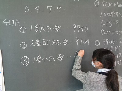 「10000までの数」や「かけ算」、「はこの形」の単元から説明問題を復習しました。