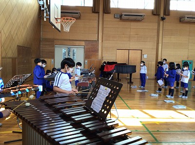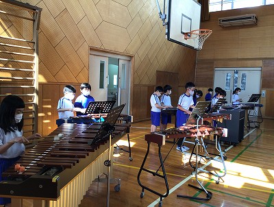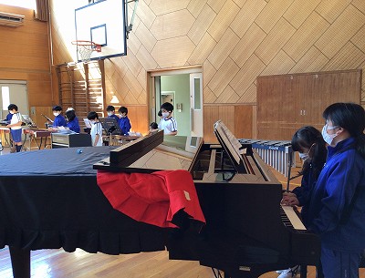 教室と体育館に分かれ、「♪さんぽ」の伴奏パートを木琴や鉄琴、オルガンなどで演奏する時間を持ちました。ピアノを選んだ友達もいました。途中のメロディを弾く練習をしている人もいます。