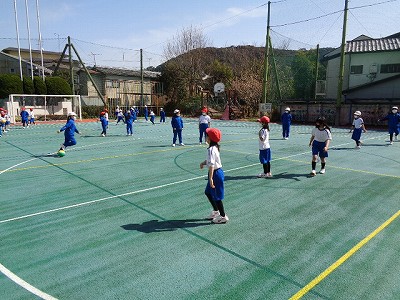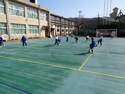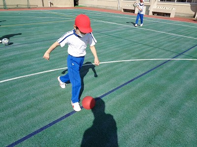 二人一組でパス練習やドリブル練習をして、楽しく取り組んでいました。