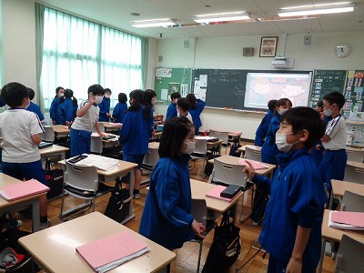 今日は、映像から「いろいろなモノ見つけ」をして、"There is a ..." "There are ..." (~があります・います)の自由発表をしました。言いたくてたまらない2年生。発表が途切れることなく続き、肝心のワークシートの学習になかなか入れずじまいでした。英語で話す意欲が旺盛です!