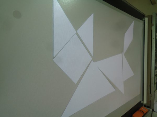 今日の算数は、三角形と四角形を使って「形づくり」に取り組みました。