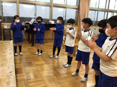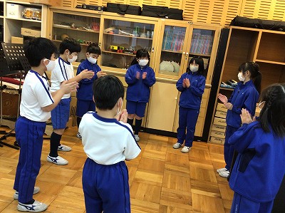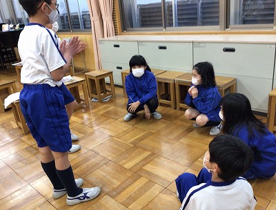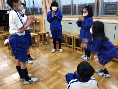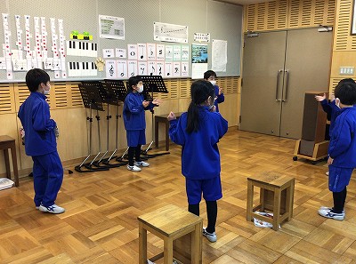 こちらのグループは、全員で試しの練習をしたリズムとは、全く違うリズムを使って“リズムの階段の上り下り”を表現したりしました。最後の一斉リズムも「タタンタタン」で、ばっちりと決めてくれました。