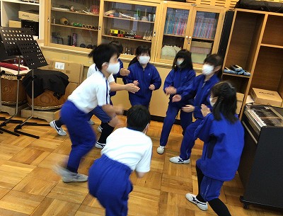 また、最後までたどり着くと、反対に一人ずつ座っていき、リズムがだんだん弱くなる様子を工夫して伝えていました。