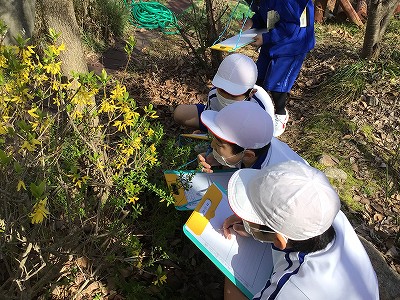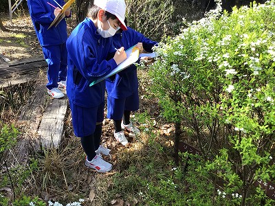 今日の生活科は『ビオトープの観察』です。2月のビートープと比べて、どのように変化してしているかをじっくりと観察しました。