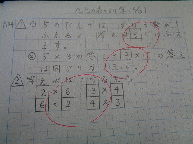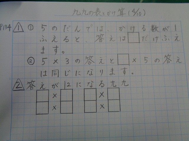 ② ノートに日づけ、P134、「九九の表とかけ算」
