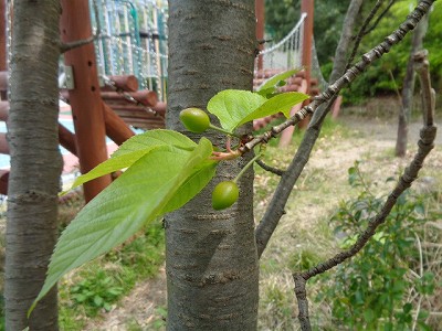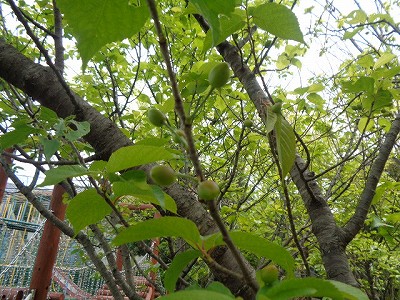木を見上げると、青い たくさんの実が ついています。