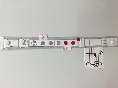 写真(しゃしん)の下が、唄口(うたくち)なので、リコーダーをかまえると、左手でふさぐところに、“赤いシール”をはっています。